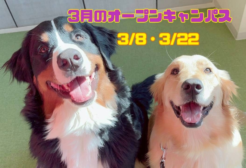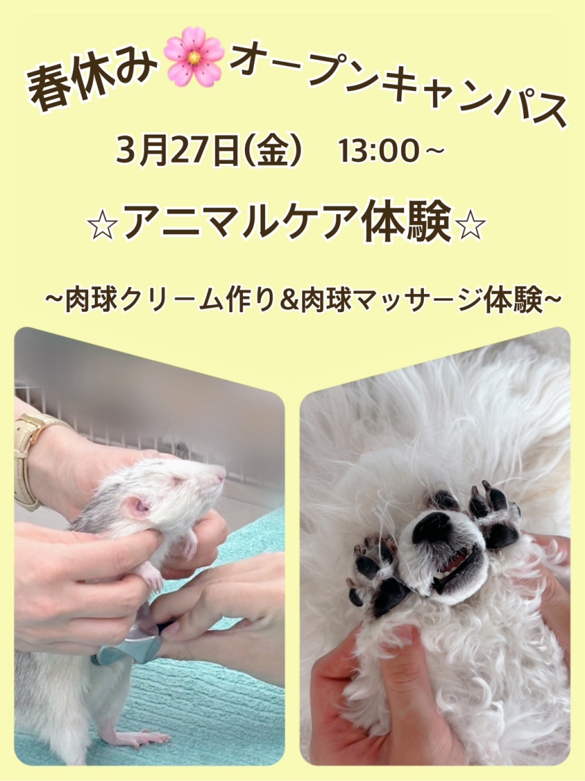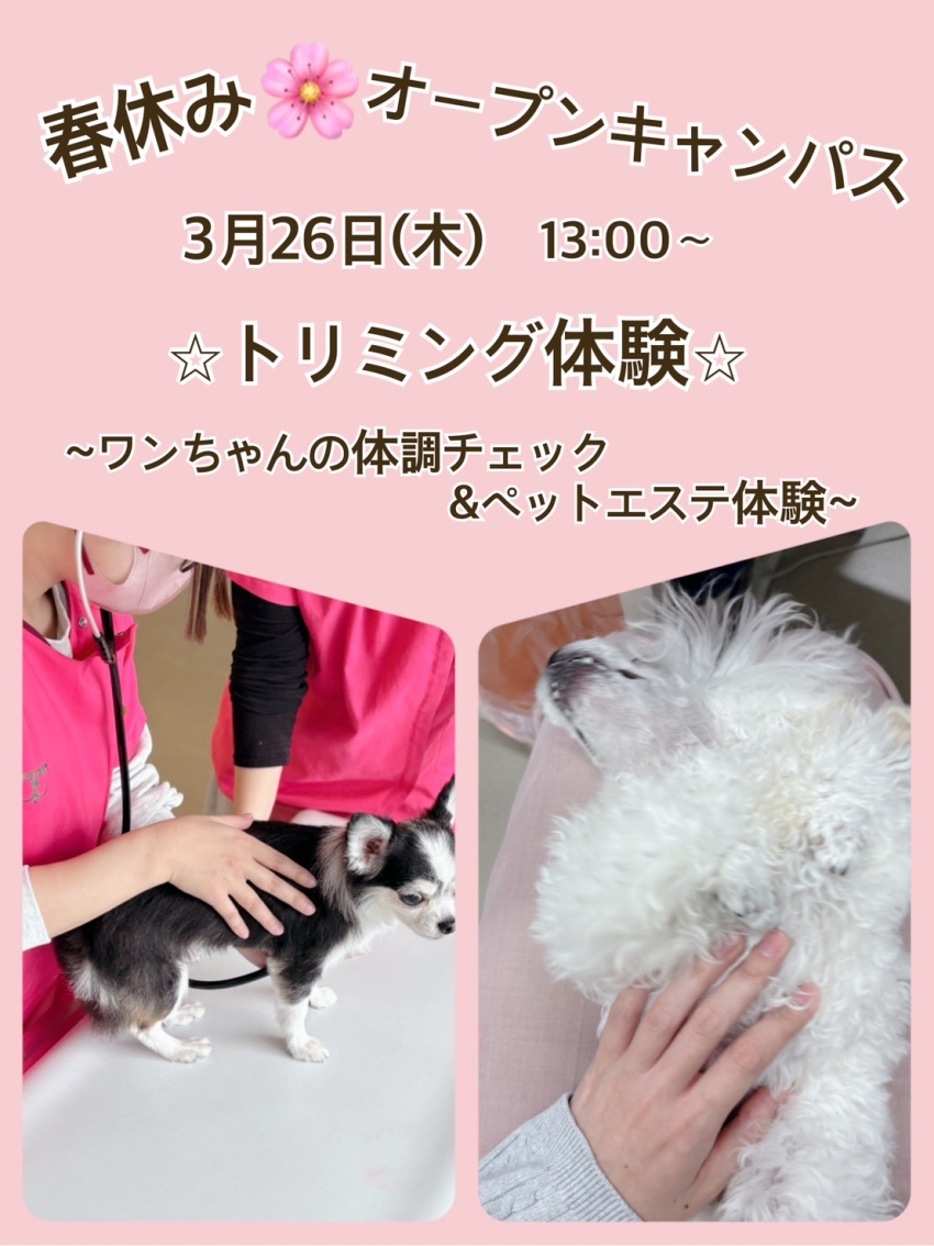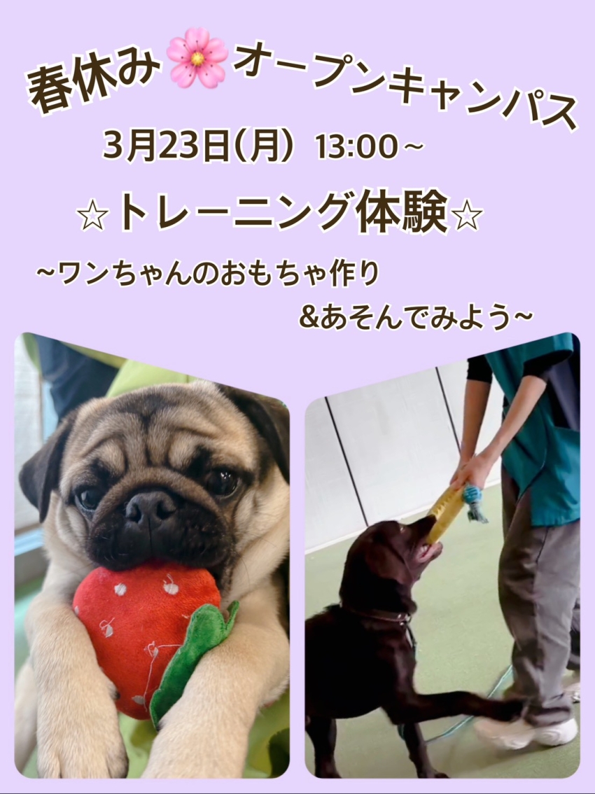 オ春休みオープンキャンパス3/23(月)トレーニング、24(火)動物看護、26(木)トリミング、27(金)アニマルケア