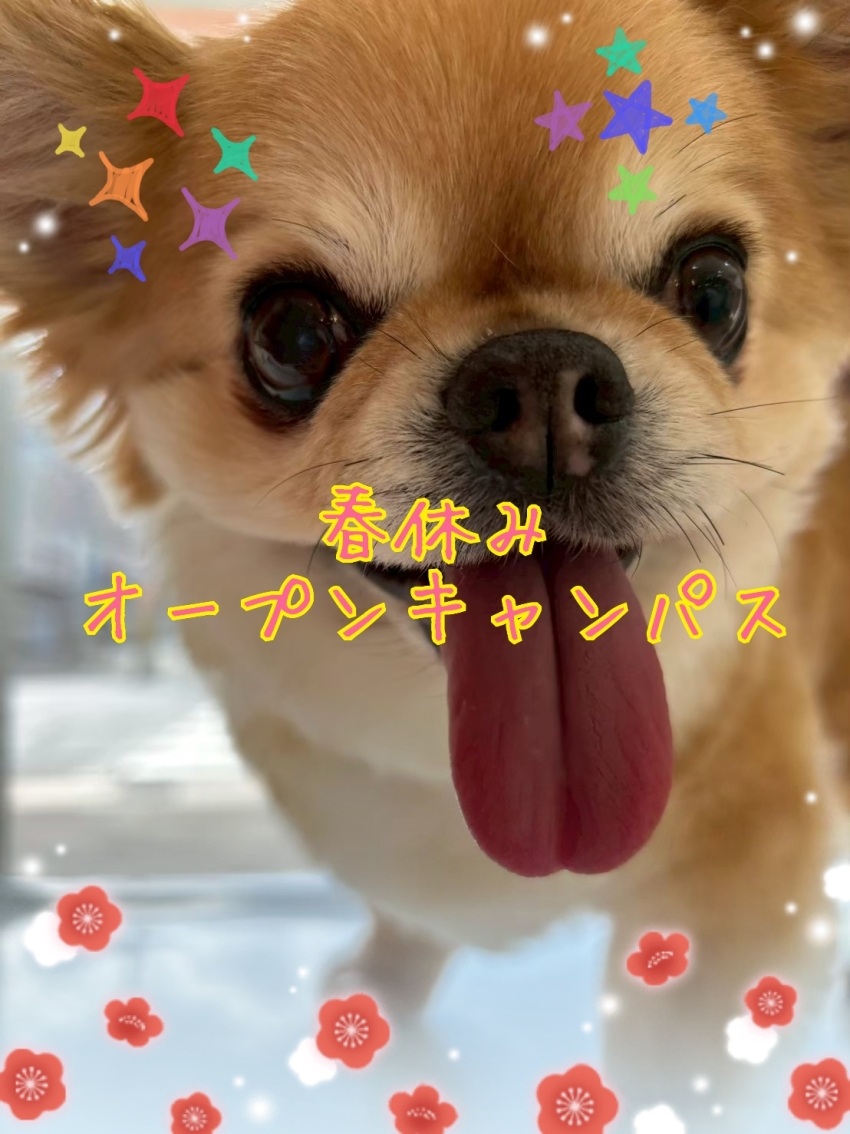 オ春休みオープンキャンパス3/23(月)トレーニング、24(火)動物看護、26(木)トリミング、27(金)アニマルケア