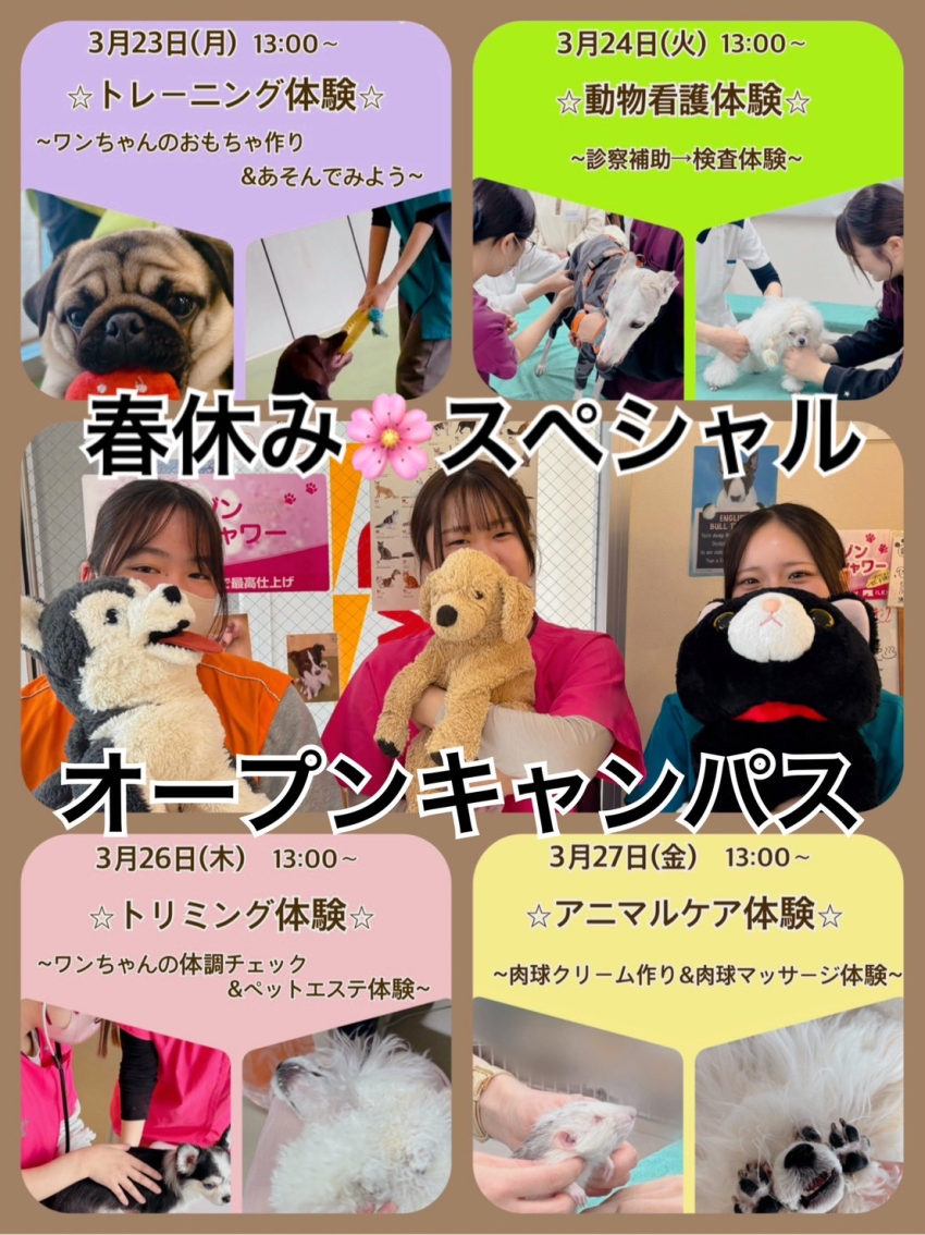 春休みオープンキャンパス!3/23(月)トレーニング、24(火)動物看護、26(木)トリミング、27(金)アニマルケア